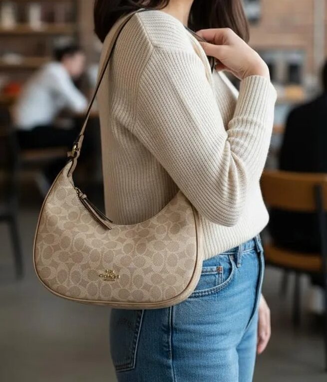 Confeccionado en lona revestida de alta calidad, este bolso presenta el distintivo patrón repetido de la letra “C” en tonos beige y marrón claro, característico de la firma Coach. En el frente, se destaca el logo metálico dorado “COACH” acompañado por el emblema de la marca, aportando un toque de lujo discreto y reconocible.