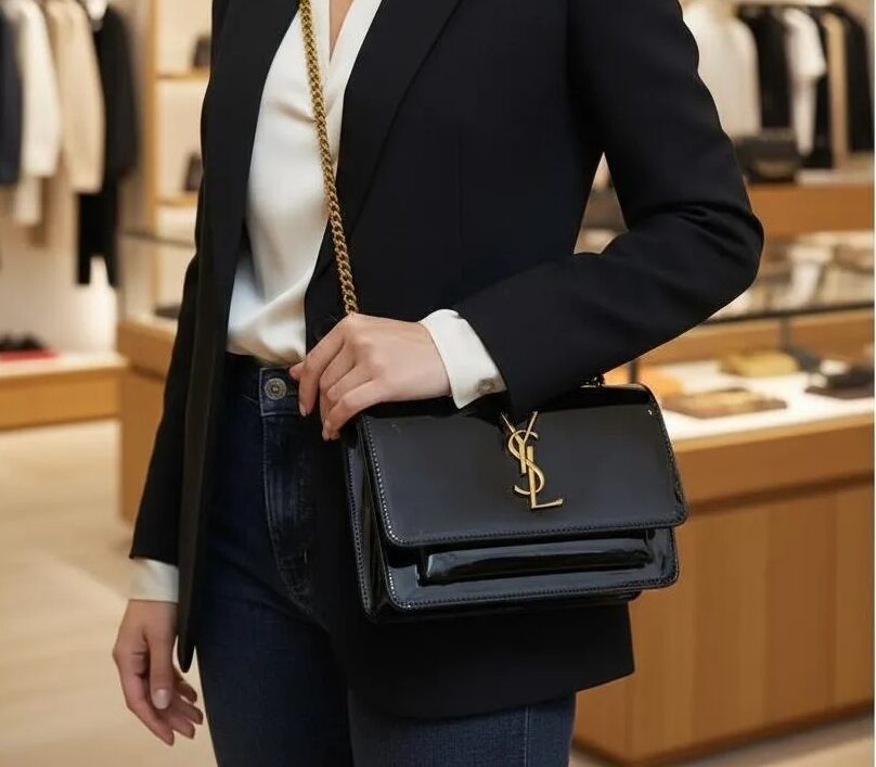 Confeccionado en charol negro de alto brillo, este bolso impresiona por su acabado lujoso y su silueta rectangular de líneas limpias y sofisticadas. La solapa frontal está adornada con el icónico logotipo “YSL” en metal dorado, símbolo de exclusividad y opulencia. El cierre se realiza mediante un broche metálico oculto, que fusiona seguridad y diseño.