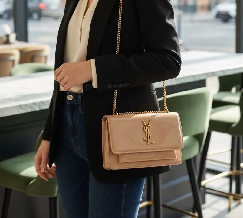 Confeccionado en charol nude de alto brillo, este bolso destaca por su acabado lujoso y silueta rectangular estilizada. La solapa delantera lleva el icónico logotipo “YSL” en metal dorado, símbolo de exclusividad y glamour, y se cierra de forma segura mediante un broche metálico oculto.