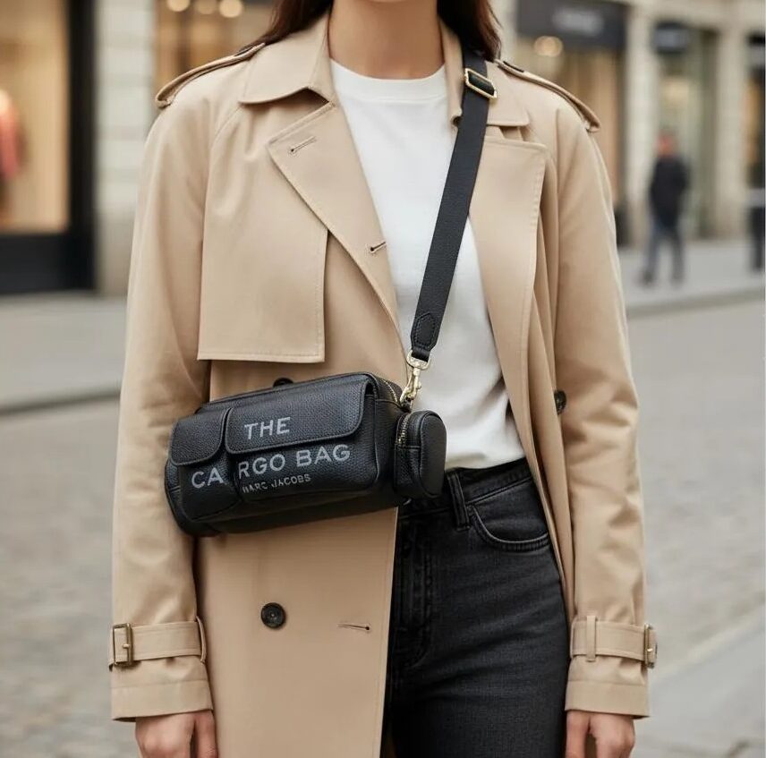 Este bolso no es solo un accesorio: es una declaración. Confeccionado en cuero negro de textura marcada, “The Cargo Bag” combina la rudeza del diseño utilitario con el refinamiento gráfico de Marc Jacobs. Cada compartimento con solapa parece decir: “Tengo espacio para lo que importa, y estilo para lo que se ve”.
