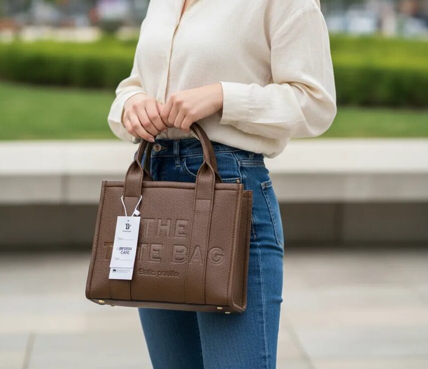 Bolso confeccionado en cuero sintético de tono café, con superficie texturizada y diseño estructurado. En el frente, se destacan las palabras “THE TOTE BAG” y “Bella Paula” grabadas en relieve, aportando identidad de marca con estética sobria y moderna. Incluye una etiqueta colgante blanca con detalles del modelo, color y código de referencia, lo que refuerza su presentación profesional.