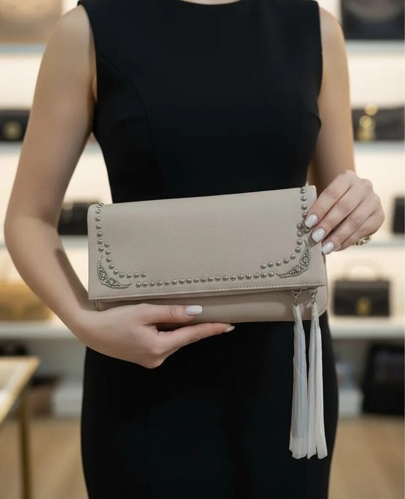 Este clutch está confeccionado en cuero sintético beige de grano fino, con estructura rectangular estilizada. Su diseño incorpora una hilera de remaches metálicos plateados que adorna la solapa, siguiendo una línea curva que acentúa las esquinas con emblemas en forma de alas, decorados con finos cristales.