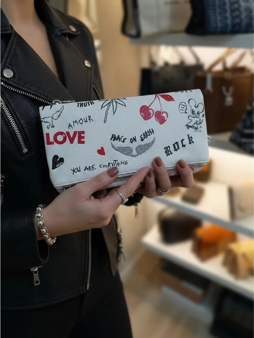 Este clutch está confeccionado en cuero sintético blanco con estructura rectangular alargada y proporciones estilizadas. Su superficie está intervenida con ilustraciones tipo graffiti que combinan símbolos y frases como “LOVE”, “AMOUR”, “TRUTH”, “PEACE ON EARTH” y “YOU ARE EVERYTHING”, acompañadas de cerezas rojas, corazones, estrellas y un personaje tipo ratón retro, todo en estilo gráfico vibrante y provocador.