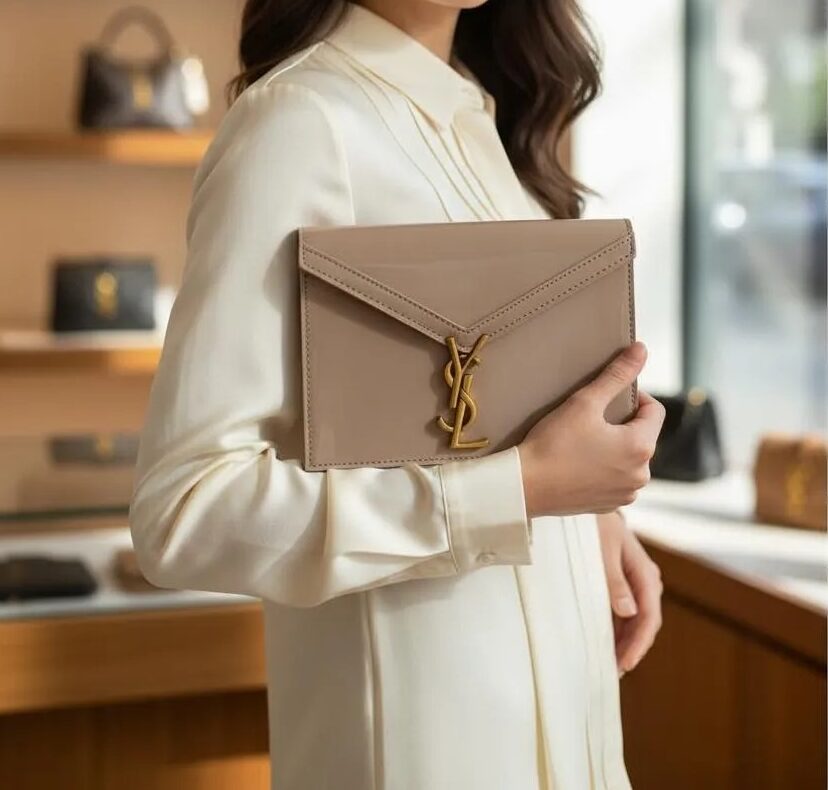 En el centro de la solapa destaca el icónico logotipo “YSL” en metal dorado, con acabado pulido e interconexión de letras que simboliza lujo y exclusividad. El cierre se realiza mediante broche metálico oculto, manteniendo la estética minimalista sin comprometer la funcionalidad.