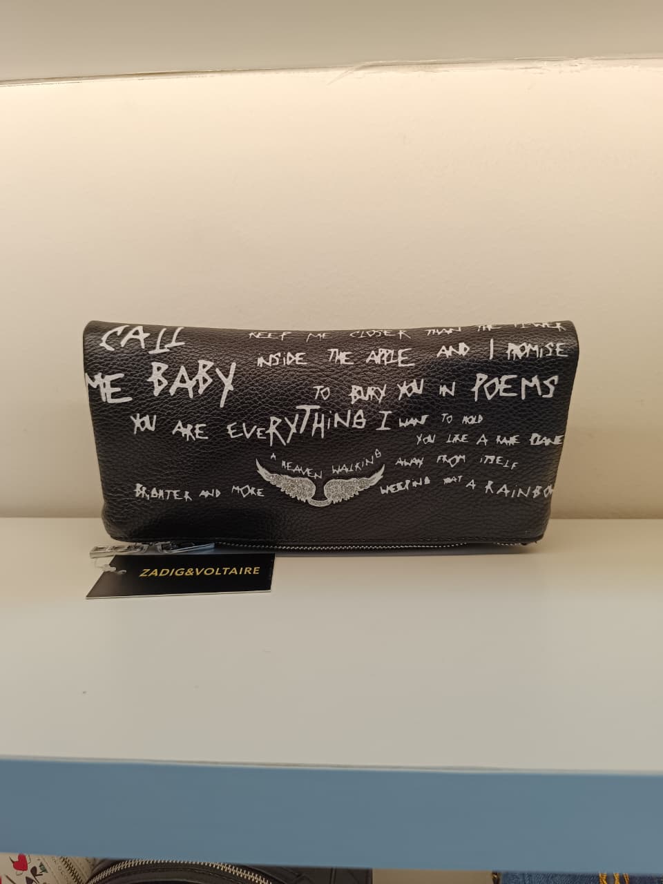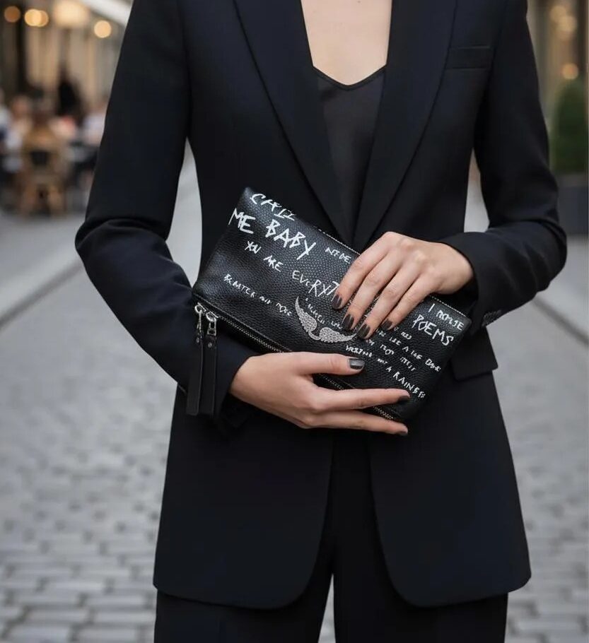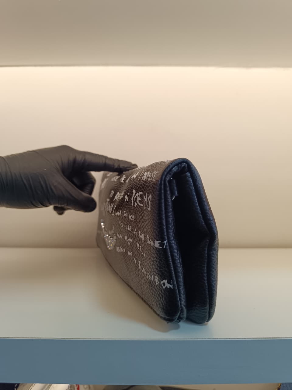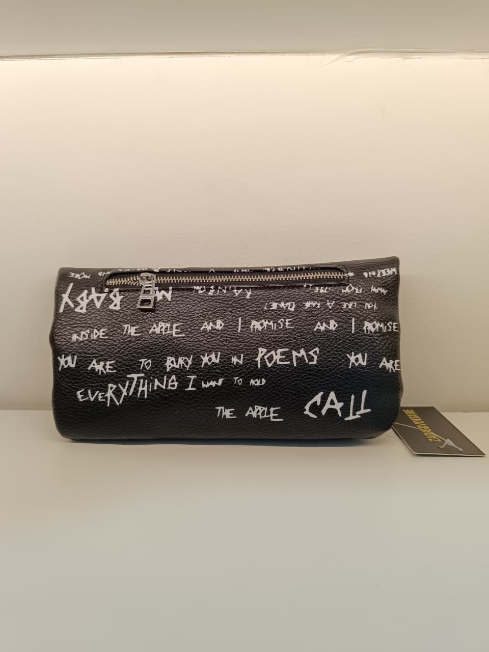 Este clutch está confeccionado en cuero sintético negro tipo grano fino, que ofrece textura y resistencia en una silueta rectangular estilizada. La superficie lleva frases escritas a mano como “ME BABY,” “EVERYTHING,” “POEMS,” “BEATEN ME YOU,” y “A LUNATIC”, creando un contraste potente y emocional en blanco sobre negro.