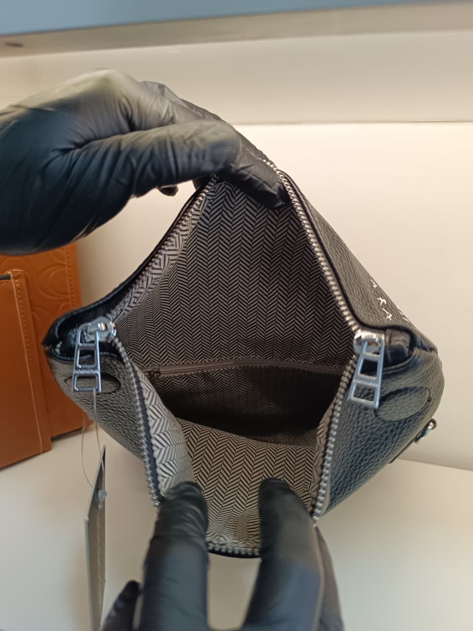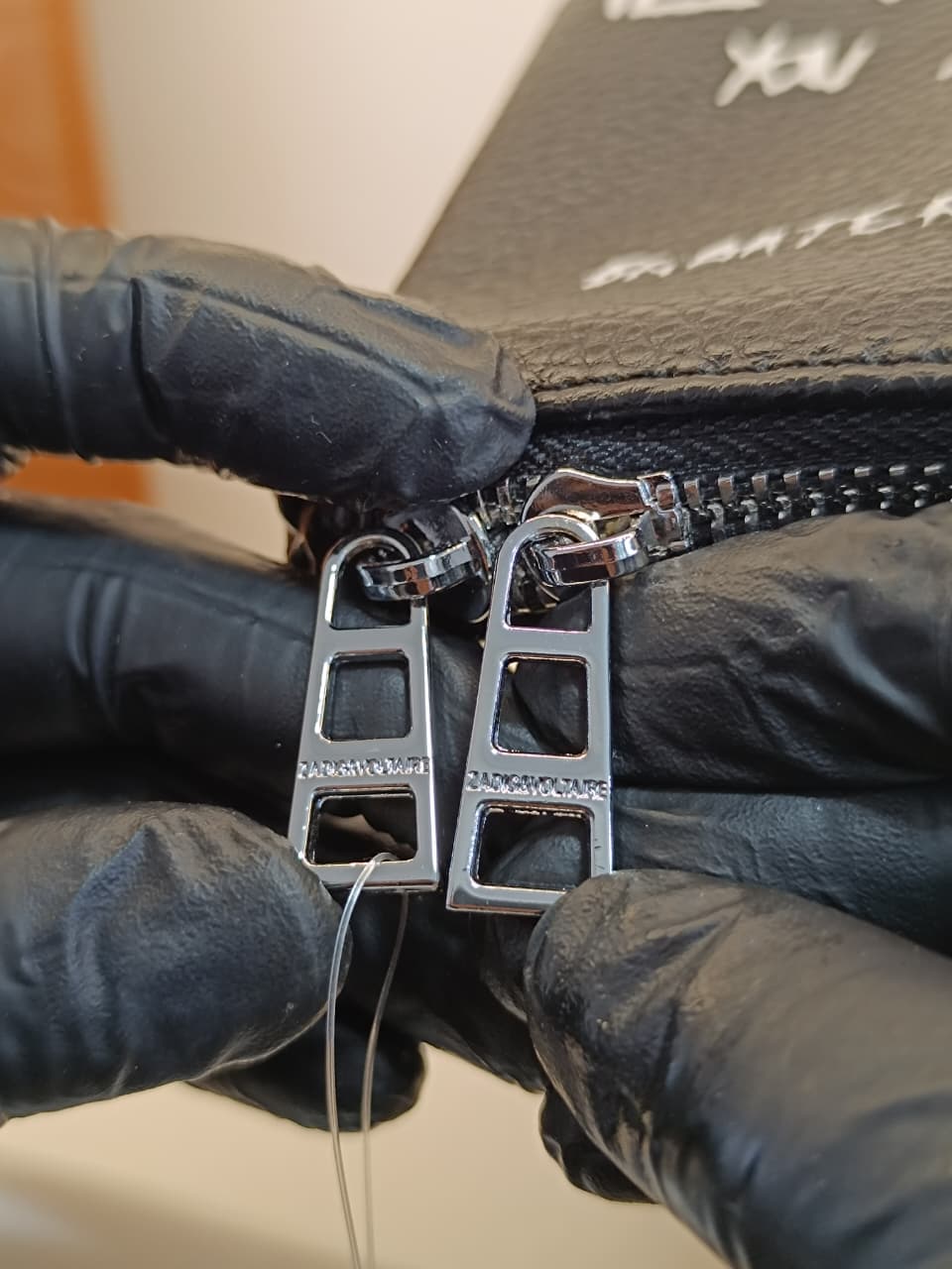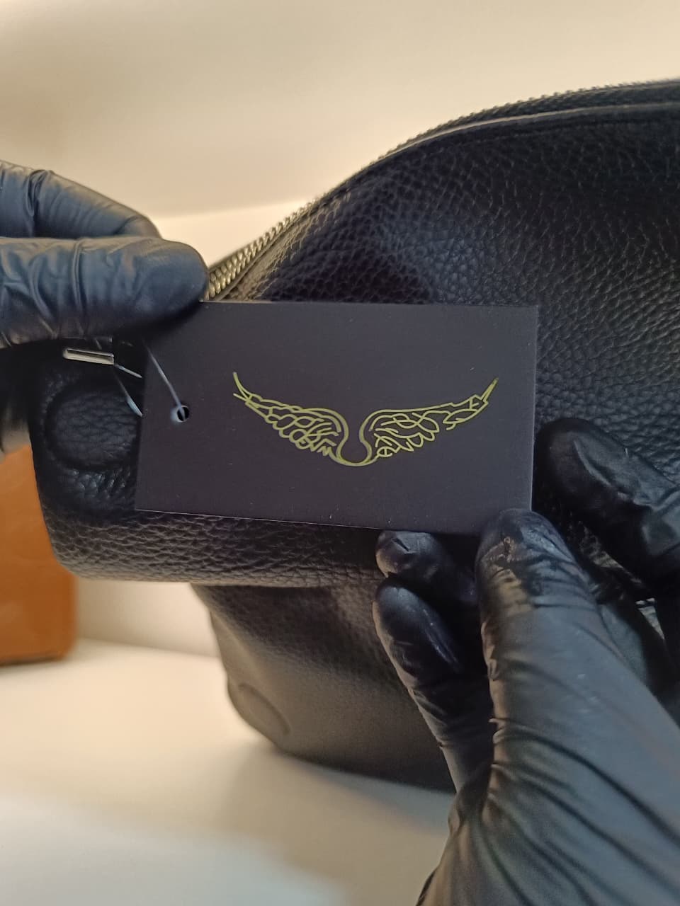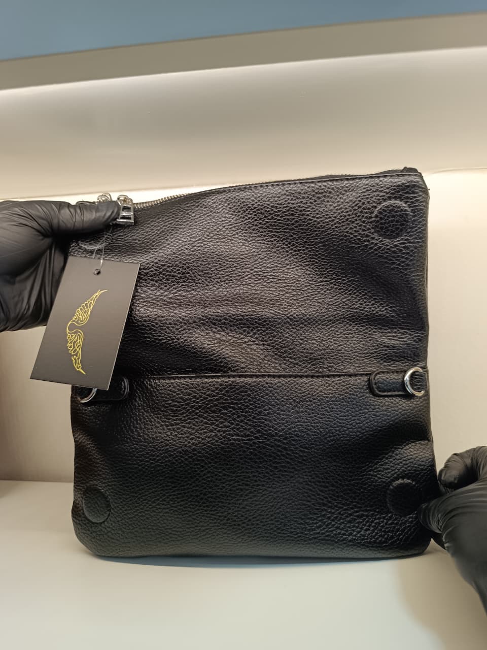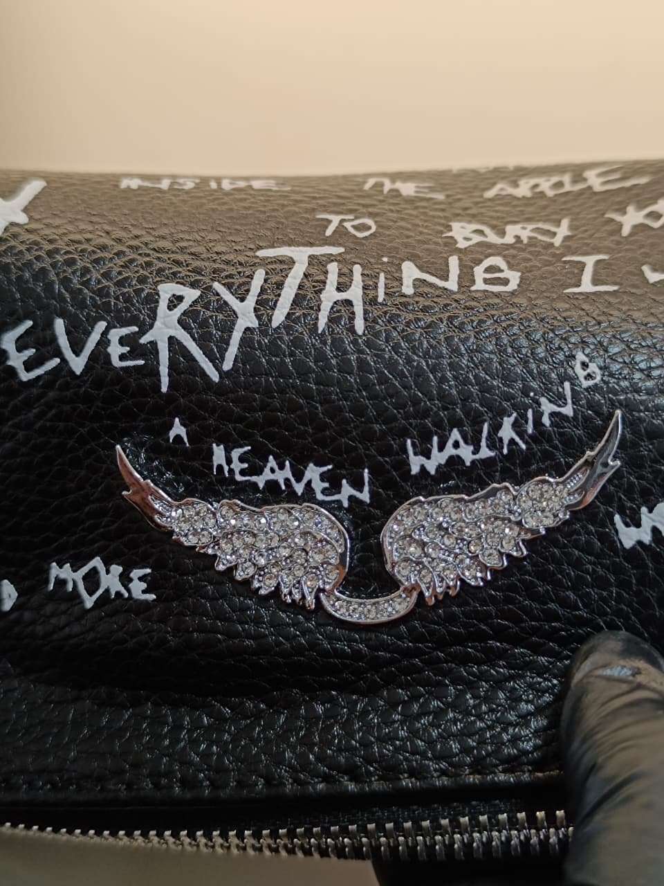 Destaca un emblema metálico en forma de alas, que añade un toque de libertad gráfica al diseño, además de un cierre horizontal de cremallera metálica en tono oscuro, que aporta funcionalidad y un aire urbano.