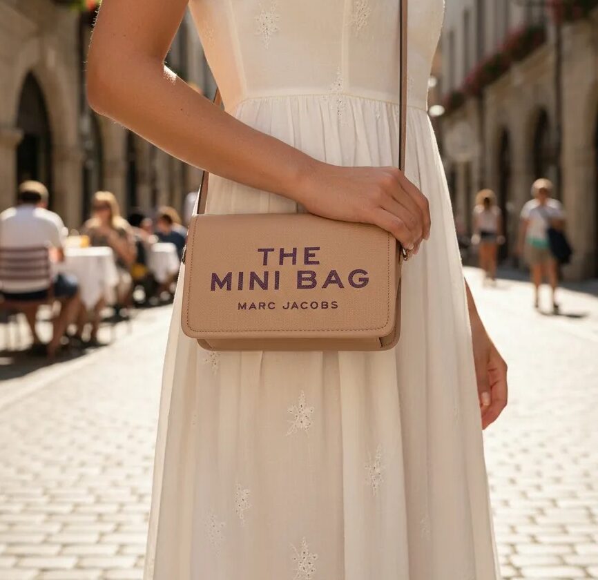 En el frente, se destaca la inscripción “THE MINI BAG” en letras mayúsculas de gran tamaño, seguida por “MARC JACOBS” en una línea inferior, ambas impresas en tipografía bold de color violeta oscuro. Este contraste gráfico refuerza la identidad visual de la marca y añade un toque moderno al diseño minimalista.