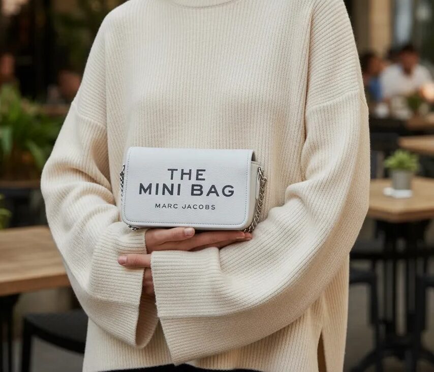 Este bolso tipo clutch está confeccionado en cuero blanco de acabado liso, con estructura rígida y formato rectangular compacto. En el frente, se destaca la inscripción “THE MINI BAG MARC JACOBS” en letras mayúsculas negras, impresas con tipografía bold que aporta un estilo gráfico y moderno, característico de la marca.