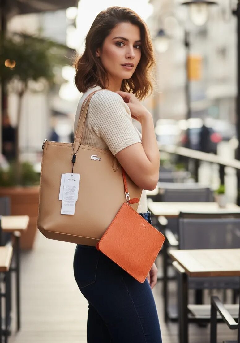 Bolso tipo tote confeccionado en cuero sintético beige de acabado liso y estructura semirrígida. En el frente, se presenta el clásico logo del cocodrilo Lacoste en tono plateado, discretamente ubicado para mantener una estética limpia y elegante. El diseño incluye un neceser desmontable en color rojo anaranjado, fabricado en cuero texturizado, con el logo Lacoste grabado en relieve. Este pouch se conecta al bolso mediante una correa lateral del mismo color, aportando contraste y funcionalidad.