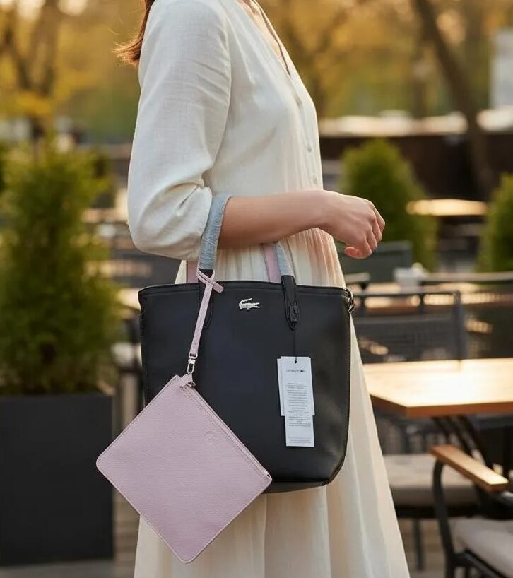 Bolso tipo tote confeccionado en cuero sintético negro de acabado liso y estructura semirrígida. En el frente, se presenta el clásico logo del cocodrilo Lacoste en relieve, aportando identidad de marca con discreción elegante. El diseño incluye un neceser desmontable en tono rosa pastel, fabricado en cuero texturizado, también con el logo Lacoste grabado, que se conecta al bolso mediante una correa lateral.